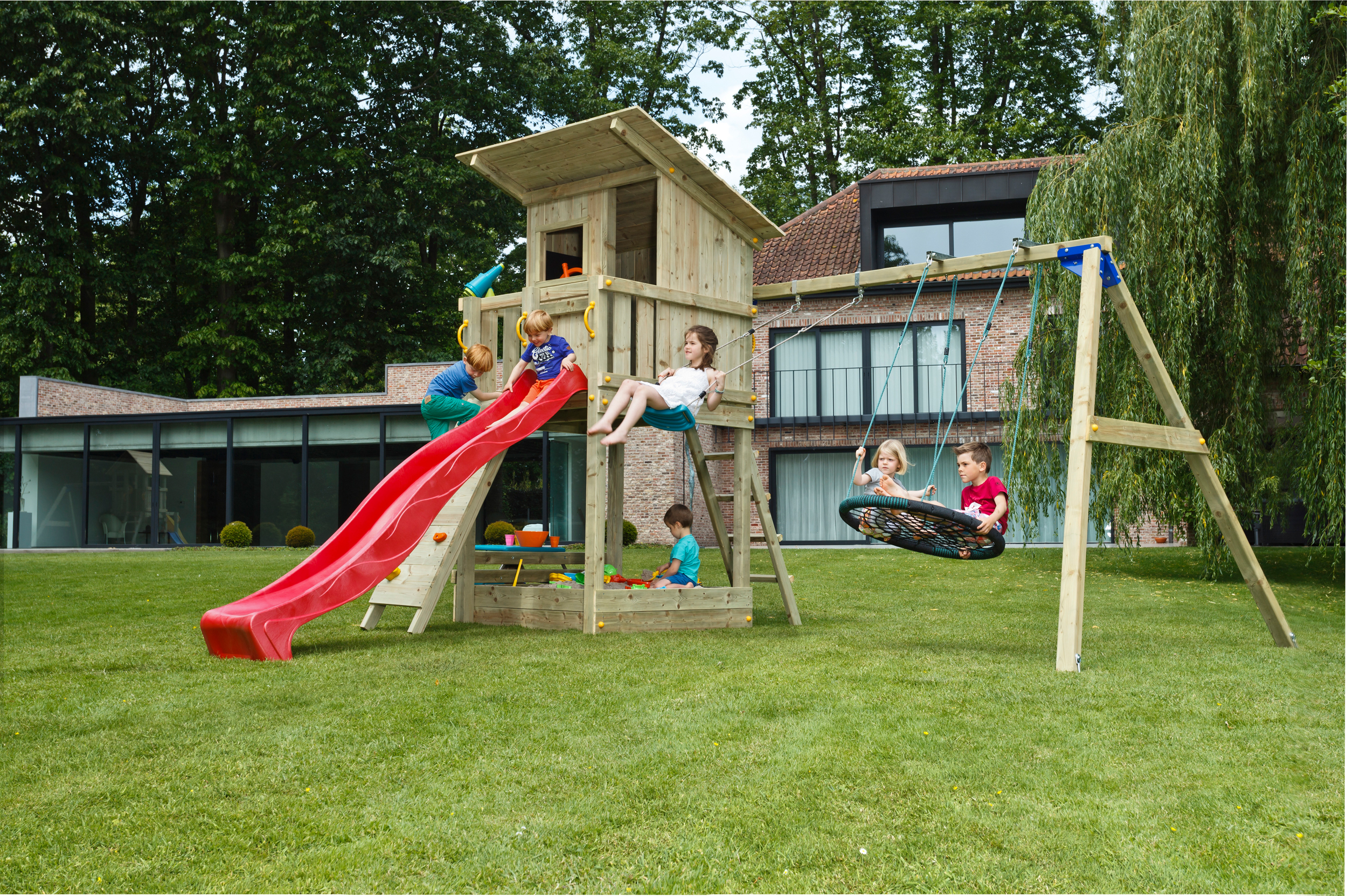Towers can be joined by a bridge and modules can be added to create a customised play system.